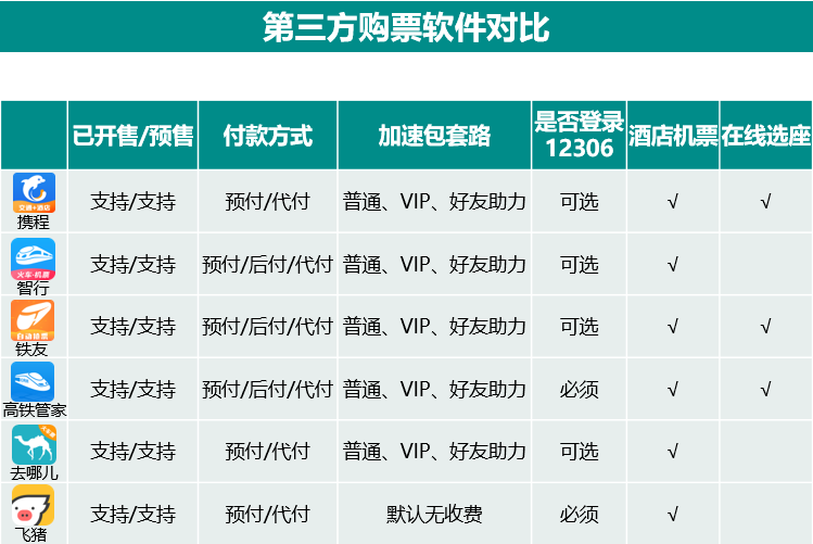 官方新策推行,第三方软件加持,出行更方便、更安全、更舒心。第三方购票软件功能逐渐完善,既可以购买已开售车票,也可以预定未开售车票,防止错过开售时间;均可以购买机票、预定酒店,出行更方便,选择更多样;除飞猪以外,各购票软件都通过三种方式用加速包提速;除高铁管家和飞猪必须使用12306账号购买车票外,其余软件可独立提供购票服务;携程、铁友、高铁管家支持在线选座,出行更舒心。软件各有千秋,总有一款适合你!