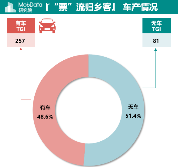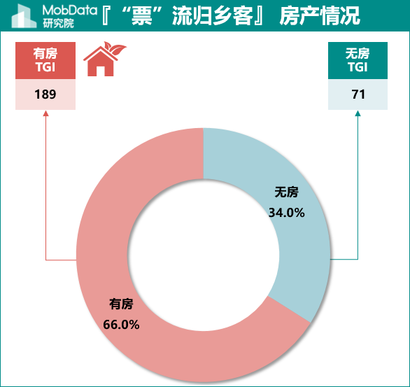 『“票”流归乡客』中有房人群占比达66.0%,有车人群占比不足一半,但TGI高达257,远高于平均水平。