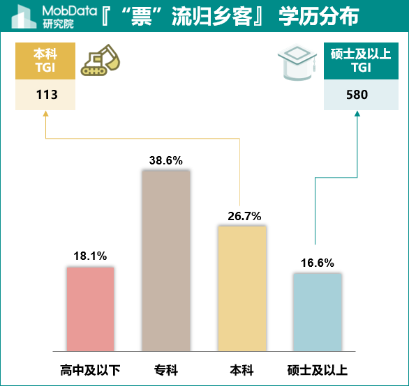 『“票”流归乡客』 中本科及以上学历达43.4%,硕士占比低但远高于平均水平。『“票”流归乡客』大都热爱生活,娱乐方式多样,其中46.7%为购物达人,8.4%为理财达人,6.7%为旅游达人,6.6%为煲剧一族。