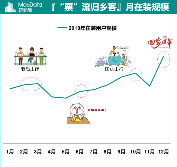 『“票”流归乡客』中购票App在装、活跃规模于寒暑假增加,春运期间达到高峰。尤其由于暑假与国庆假的连续性,这段时期在装规模呈增长趋势。