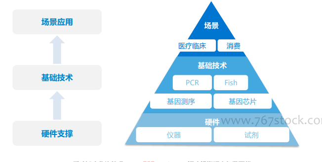 PCR 和 Fish 技术辅助基因测序和基因芯片主导检测技术。基因检测在服务于不同的应用时,会利用不同的检测技术。常见且使用频繁的包括基因测序技术和基因芯片。两种检测技术都会多少依托于 PCR 和 Fish 带来的技术基础。