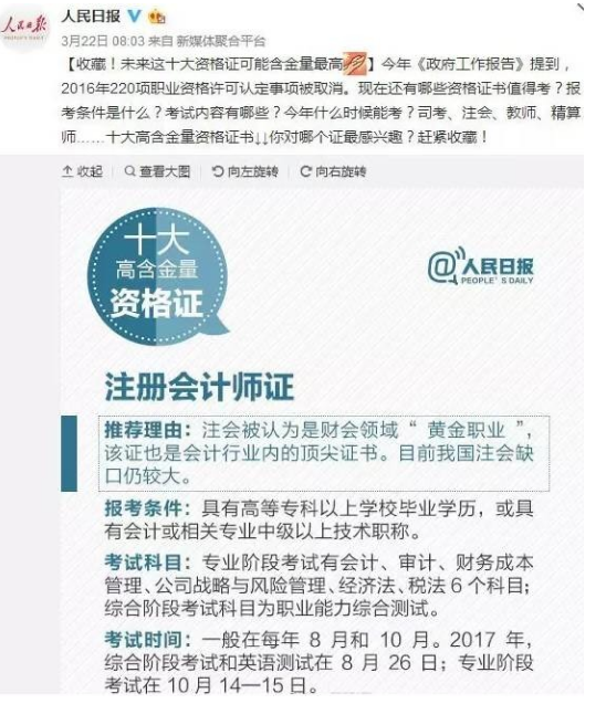 人民日报曾经发表过文章说过十大含金量的证书中,注册会计师赫然在列。从中我们也可以看出注册会计师证书的含金量有多高。