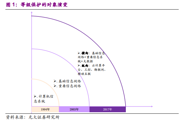 保护对象扩展,实际监管的范围扩大。早在 1994 年,国务院颁布《中华人民共和国计算机信息系统安全保护条例》,规定计算机信息系统实行安全等级保护。而后在 2003 年,中办、国办转发的《国家信息化领导小组关于加强信息安全保障工作的意见》中指出,“要重点保护基础信息网络和关系国家安全、经济命脉、社会稳定等方面的重要信息系统”。