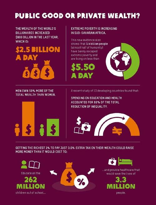 国际发展及救援的非政府组织乐施会(Oxfam)一份题为《Public Good or Private Wealth》的报告发现,目前全球最富有的26位亿万富翁拥有的财富,与全球38亿底层人口一样多,而38亿人口约占全球总人口的一半。在2017年,全球前43位亿万富翁的财富才能达到这个水平,在2016年则是61位。
