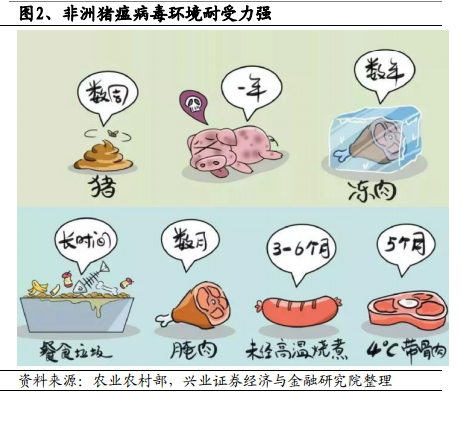 非洲猪瘟病毒可灭活。虽然在环境中比较稳定,但非洲猪瘟病毒在猪肉烹煮处理过程中较易失活,非洲猪瘟病毒在 55℃30 分或 60℃10 分钟环境下将被破坏,70℃加热 30 分钟以上,病毒就会被杀灭。烟熏和添加香辣剂的香肠以及风干火腿,在32-49℃熏制 12 小时以上,或风干 25-30 天均可使病毒灭活而失去感染性。