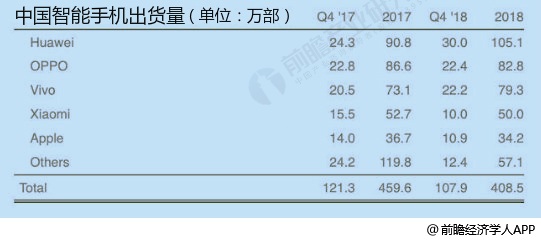 2、如果只看2018年第四季度,因为新 iPhone 上市,小米被苹果超越,跌落至第五;