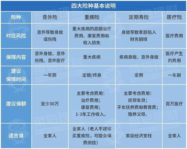 承担主要经济责任的家庭成员,发生任何风险,对家庭的影响和打击都是致命的,因此,需要完整配备意外险、重疾险、定期寿险和医疗险四大险种。