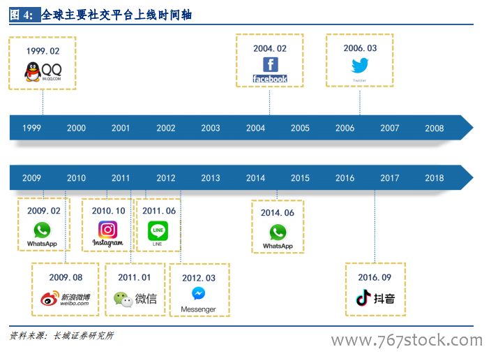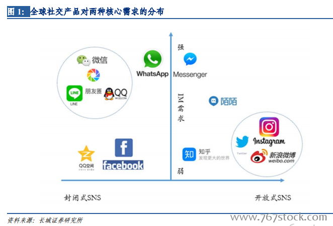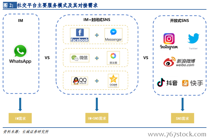 “开放式SNS”为用户提供了公开的面向全体网民的分享互动平台,以Instagram、Twitter、微博、抖音、快手等为代表。“开放式 SNS”通常不为用户提供即时通讯功能,而是聚焦于为用户提供与开放关系链网络的交流平台,这种服务模式因不受封闭关系网壁垒的束缚从而具有较强的传播性,信息可以在更大的范围内传播,契合了用户在现实及陌生网络关系链中的 SNS 需求。