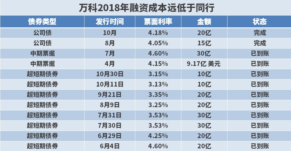 2018年,万科通过8笔超短债、两笔公司债融资195亿元,融资成本在3.25%-4.6%,另外通过发行两次中期票据分别融资30亿人民币和9.17亿美元,利率在4.15%和4.6%之间。可以得知,万科2018年的加权平均融资成本仅3.91%。