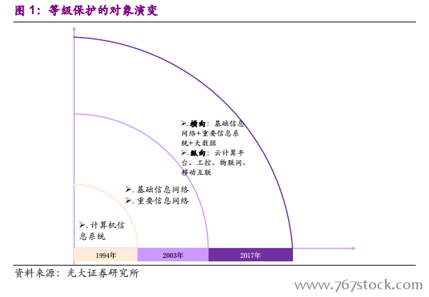 保护对象扩展,实际监管的范围扩大。早在 1994 年,国务院颁布《中华人民共和国计算机信息系统安全保护条例》,规定计算机信息系统实行安全等级保护。而后在 2003 年,中办、国办转发的《国家信息化领导小组关于加强信息安全保障工作的意见》中指出,“要重点保护基础信息网络和关系国家安全、经济命脉、社会稳定等方面的重要信息系统”。