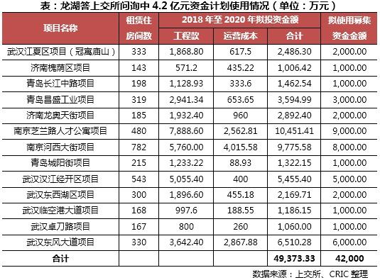 以龙湖2019年1月7日获批的50亿元住房租赁专项公司债为例,龙湖计划35亿元用于与住房租赁相关的项目建设,15亿元用于补充公司运营资金,用于住房租赁资金占比70%。首期计划发行10元,其中2.8亿元拟用于住房租赁项目建设,4.2亿元拟用于住房租赁项目装修改造及租赁,剩余3亿元拟用于补充公司营运资金。龙湖在答复上交所问询中,将2.8亿元资金的使用项目由成都武侯锦簇星悦荟、杭州彭埠住宅项目、苏州(楼盘)石湖东路调整成苏州白马涧项目、杭州彭埠住宅项目、上海奉贤南桥项目,更改后的项目,用于租赁性质部分的面积更加明确,且比例更高;此外,在龙湖募集说明书的申报稿中,对于装修改造项目只是进行了简单的陈述,无具体改造面积或房间数信息,在答复中,对项目的具体情况用列表进行了详细的说明,每个项目拟使用募集资金比例情况也清晰可见。