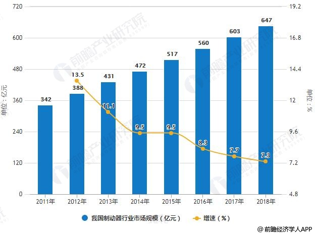 根据前瞻产业研究院发布的《中国制动器制造行业产销需求与投资预测分析报告》显示,2012-2017年我国制动器行业市场规模不断扩大。2017年我国制动器行业市场规模达到了603亿元,2018年虽然汽车产销量有所下滑,汽车整车配套制动器市场规模下降,但维修市场依旧庞大,受到价格上升、工程机械行业发展良好等多方因素影响,总体市场规模达到约647亿元,同比增长7.3%,增速略有放缓。