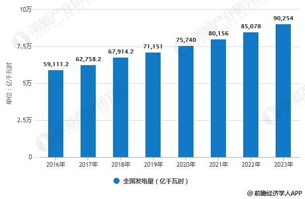2016年,全国发电量为59111.2亿千瓦时,同比增长4.5%。到了2017年全国发电量为62758.2亿千瓦时,同比增长5.7%。截止至2018年底,全国累计发电量达到了67914.2亿千瓦时,同比增长6.8%。预计2019年我国发电量将突破70000亿千瓦时,达到71,151亿千瓦时。未来五年(2019-2023)年均复合增长率约为6.13%,并预测在2023年我国发电量将达到90254亿千瓦时。