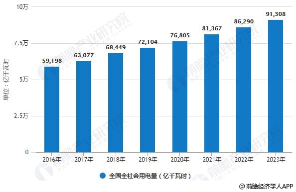 据前瞻产业研究院发布的《中国电力行业市场前瞻与投资战略规划分析报告》统计数据显示,2016年全国全社会用电量已达59198亿千瓦时,同比增长5.0%。到了2017年全社会用电量达到63077亿千瓦时,同比增长6.6%。截止至2018年底,全社会用电量达到了68449亿千瓦时,同比增长8.5%,比上年提高1.9个百分点。预计2019年我国全社会用电量将突破70000亿千瓦时,达到72,104亿千瓦时,未来五年(2019-2023)年均复合增长率约为6.08%,并预测至2023年全国全社会用电量将达到91308亿千瓦时。