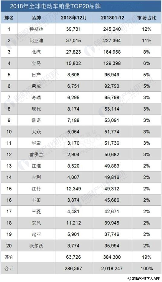 2018年全年全球电动车品牌销量TOP20:特斯拉打败比亚迪、北汽,宝马紧随其后