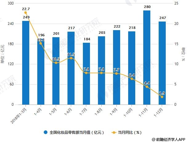 截止至2018年12月份化妆品零售额为247亿元,与去年同期相比增长1.9%。累计方面,2018年1-12月全国化妆品零售额为达2619亿元,同比增加9.6%,高于同期社会消费品零售总额增速0.6个百分点。