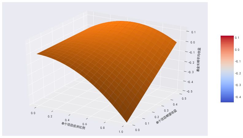 同时我们假设了单个项目的期望收益在一定范围,我们可以发现在每个项目投资比例过大超过某一个数值时,长期收益会急速下降,再一次说明分散投资的重要性。