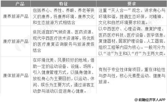 康养旅游由三大产品体系构成:即康养旅游产品、康疗旅游产品和康体旅游产品,各产品又包含各种细分产品。下表为三大产品的特点及要求: