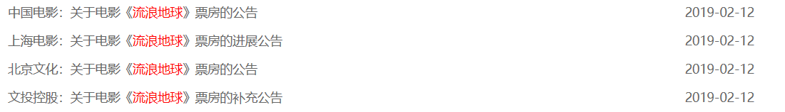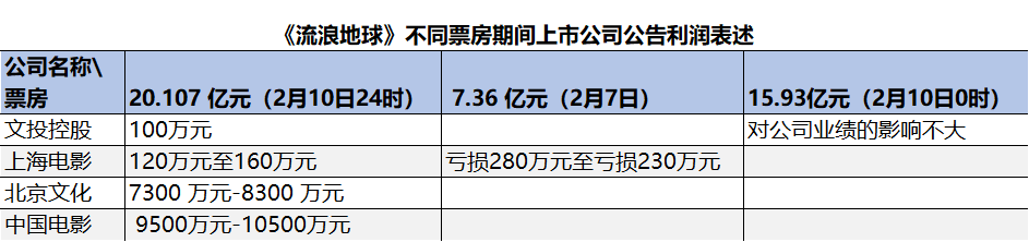 与此同时2月12日,中国电影、上海电影、北京文化、文投控股均发布了“关于电影《流浪地球》票房”的相关公告。公告均以2月10日24时的票房20.1亿为统计口径,但其预计利润数额却两极分化。
