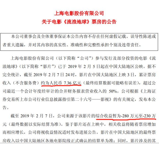 上述分化显然不止于投资数额的差距。此前的2月7日的,《流浪地球》联合出品方上海电影曾在票房7.36亿时公告,预测投资该片综合收益暂为亏损230万~280万元左右。