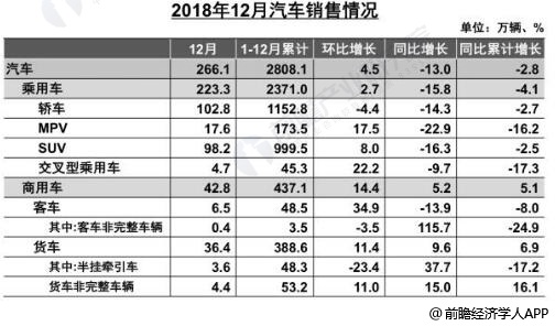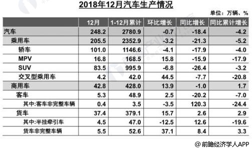 据前瞻产业研究院发布的《中国汽车整车制造行业需求前景预测与投资战略规划分析报告》统计数据显示,2018年12月,汽车生产248.22万辆,环比下降0.65%,同比下降18.39%;销售266.15万辆,环比增长4.46%,同比下降13.03%。其中,乘用车生产205.46万辆,环比下降3.22%,同比下降21.27%;销售223.31万辆,环比增长2.74%,同比下降15.84%,商用车生产42.75万辆,环比增长13.88%,同比下降0.98%;销售42.84万辆,环比增长14.43%,同比增长5.24%。