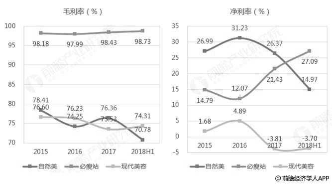 2015-2018年中国主要上市美容机构毛利率及净利率统计情况