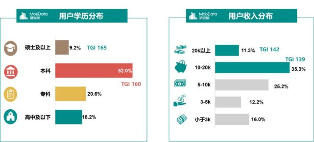 用户学历分布上以本科为主,与此同时受到硕士及以上学历偏爱,收入分布上普遍偏高,月收入10-20K占比最高,达到35.3%。
