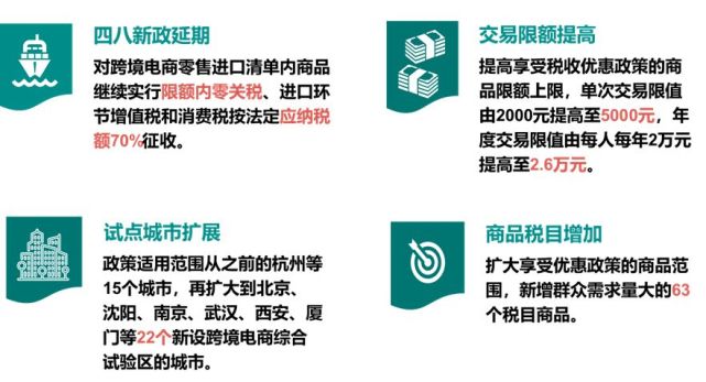 2018年11月,商务部、财政部等十几个部委联合发布了三份进口跨境电商政策文件,就跨境电商进口税收、享受税收优惠的商品限额、试点城市范围及商品清单范围做出一系列调整;“四八”新政得到第三次延期。