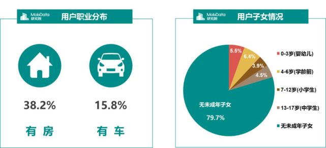 大部分用户未婚且无未成年子女,有房比例达到38.2%,有车比例15.8%,均占比不高。