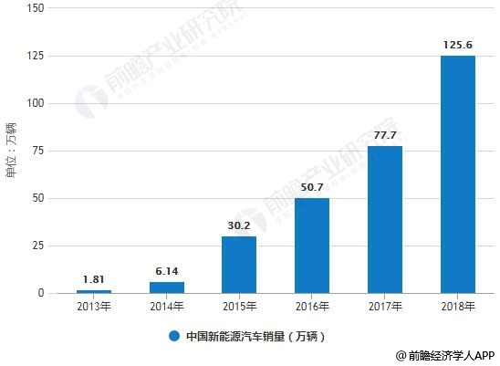 “国六”排放标准与新能源汽车补帖政策前后衔接,对新能源汽车产业的发展形成持续的推动力。据前瞻产业研究院发布的《中国新能源汽车行业市场前瞻与投资战略规划分析报告》统计数据显示,2017年,我国新能源汽车生产79.4万辆,同比增长53.8%;销量77.7万辆,同比增长53.3%。新能源汽车市场占比为2.7%,其保有总量已突破180万辆。截止至2018年我国新能源汽车产销量分别完成了127万辆和125.6万辆,同比分别增长了59.9%和61.7%。其中纯电动汽车产销分别完成98.6万辆和98.4万辆,同比分别增长47.9%和50.8%。插电式混合动力汽车产销分别完成28.3万辆和27.1万辆,同比分别增长122%和118%。
