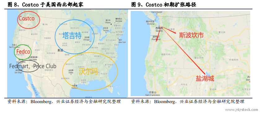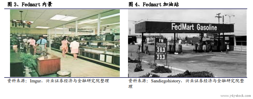 Fedmart 前期开创多项零售举措,被收购后未能坚持经营逻辑而倒闭。1954 年来自圣地亚哥的职业律师 Sol Price 根据 Fedco 的模式创立 Fedmart 会员店,同时期,日后 Costco 的创始人 Jim Sinegal 进入 Fedmart 开始实习,并受到了 Price 的注意,日后两人成为亦师亦友的关系。Price 率先推出了几项创新举措:FedMart 成为第一家以批发价出售汽油的零售商;首次设置了店内药房、光学部门。除了开发多个行业第一,Price 还引导公司进入食品零售业,并成为支撑 Fedmart 发展的产品线。1975 年来自德国的 Hugo Mann 收购 Fedmart 三分之二的股权、私有化公司并解聘创始人 Price。虽然私有化后 Mann 为公司注入资金并快速扩张,但 Fedmart于 20 世纪 80 年代初开始亏损,到 1985 年倒闭。分析 Fedmart 倒闭的原因可知,Mann 不理解会员制门店的经营逻辑,于并购后不到一年时间内开始提升商品价格以获得更多利润,公司经营没有跟上门店快速扩张的脚步导致聚客能力的大幅减弱。我们认为,由于会员制商店的独特性质,传统零售公司创造利润的销货差价仅可以覆盖商品成本和经营费用,而真正的利润源于会员费。所以会员店的经营逻辑是通过商品销售实现聚客并获得会员增量及续费。