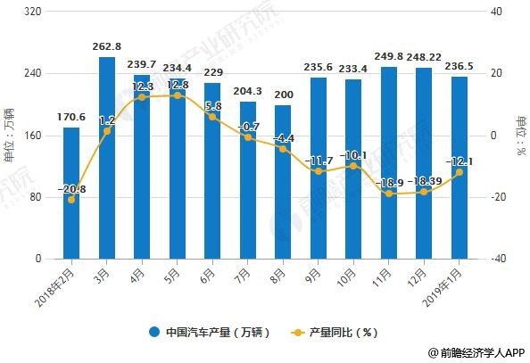 据前瞻产业研究院发布的《中国汽车整车制造行业需求前景预测与投资战略规划分析报告》统计数据显示,2019年1月产销量同比呈现下降,降幅均超10%,大多数车型产销水平均低于上年同期。2019年1月,中国汽车产销量分别完成236.5万辆和236.7万辆,产销量比上月分别下降4.7%和11.1%,比上年同期分别下降12.1%和15.8%。包括轿车、SUV在内的多个车型产销水平均低于上年同期,行业整体呈现出销量降幅略大于产量的情况。