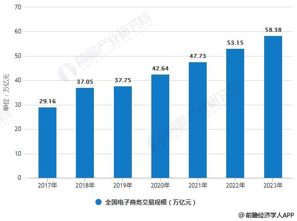 据前瞻产业研究院发布的《中国电子商务行业市场前瞻与投资战略规划分析报告》统计数据显示,截止至2017年2017年全国电子商务交易规模达29.16万亿元,同比增长11.7%。其中商品、服务类电商交易额21.83万亿元,同比增长24.0%;合约类电商交易额7.33万亿元,同比下降28.7%。初步测算2018年全国电子商务交易规模达到了37.05万亿元左右。预测2019年全国电子商务交易规模将达37.75万亿元。未来五年(2019-2023)年均复合增长率约为11.52%,并预测在2023年全国电子商务交易规模将达到58.38万亿元。