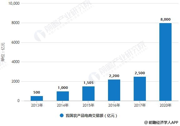 据前瞻产业研究院发布的《中国农村电商市场前瞻预测与投资规划分析报告》统计数据显示,截止至2017年我国农村网络零售额超过1.2万亿元,其中农产品网络零售交易额占20%。2015年我国农产品电商交易额达到1505亿元,2017年我国农产品电商交易额增长至2500亿元。预测2020年我国农产品电商交易额将达到8000亿元,2015-2020年复合年增长率为39.8%。由此可见,海量的市场需求,匹配中国分散的小农户、小生产者的供应现状,中国的“农产品上行”存在着巨大上升空间。