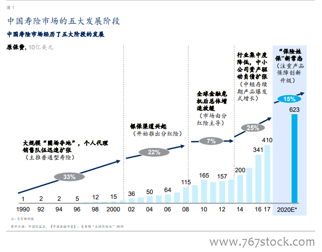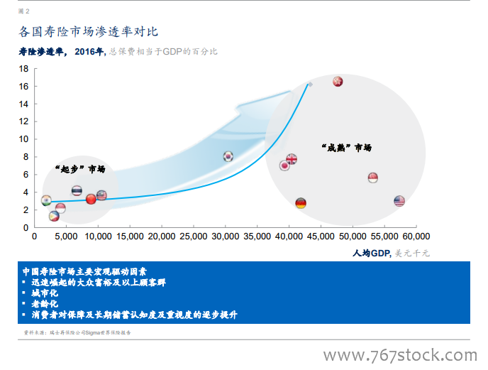 中国寿险市场仍处于发展初期,未来增长潜力巨大。与欧美成熟市场5%-10%的寿险渗透率1相比,目前中国市场仅约3%,属于起步市场阵营,对比其他市场仍有很大发展空间(见图2)。展望未来,随着经济发展与社会结构日趋成熟,人均产值与寿险渗透率将同步提升,这也是寿险市场蓬勃发展的动力来源。