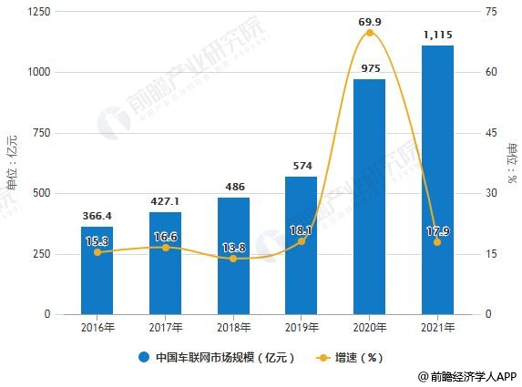 据前瞻产业研究院发布的《中国车联网行业市场前瞻与投资战略规划分析报告》统计数据显示,2016年中国车联网市场规模已达366.4亿元。初步测算2018年中国车联网市场规模已达到486亿元。预测2019年中国车联网市场规模将达到574亿元。同时由于2020年5G技术的推广应用、V2X技术发展、用户增值付费提升等因素,市场迎来爆发式增长,增速超过60%。并预测在2021年中国车联网市场规模将突破千亿元,达到了1155亿元,同比增长17.9%。