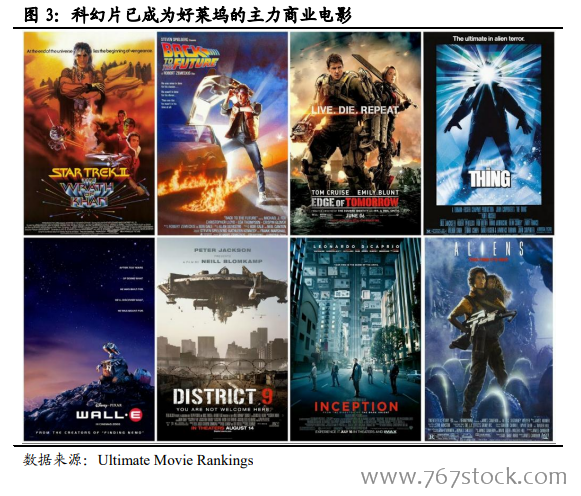 经历百年发展,从亚文化走向票房王者。20 世纪左右科幻电影几乎与电影同时诞生,此后 100 年间其发展与社会环境、科学发展关联紧密,主要可分为 4 个历史阶段,最终从亚文化 B级片成长为 21 世纪科学与艺术完美结合的商业大片。1902 年法国导演乔治·梅里埃拍摄的《月球旅行记》是第一部真正意义上的科幻电影,该影片首次动用大量演员及特效讲述了一个完整的太空故事。此后随好莱坞制片厂制度的出现,美国科幻片制作迅速发展。20 世纪 70 年代前后航空技术竞赛、成功登月等技术发展使人们对科幻电影兴趣倍增,诸多里程碑式的影片如探索宇宙的《2001 太空漫游》、幻想与外星人接触的《星球大战》和《E.T.外星人》均在这个阶段诞生。这一阶段不仅出现了现代科幻电影的开山之作,也激发了一大批新生代科幻题材导演的灵感。之后随工业数字技术的迅速崛起,科幻电影的视觉质量得到大幅提升,结合对技术和未来的反思,最终成就 2009 年上映的科幻片里程碑之作《阿凡达》。至此,科幻片已经成为好莱坞的主力商业电影,视觉特效与哲学反思共存,受众也扩散至全部观影人群。