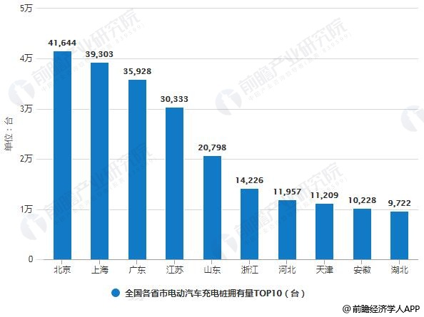 其中,2018年,我国省级行政区域内所拥有的公共类充电桩数量前十的分别为:北京41644个、上海39303个、广东35928个、江苏30333个、山东20798个、浙江14226个、河北11957个、天津11209个、安徽10228个、湖北9722个。