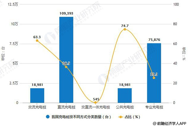 根据中国电动汽车充电基础设施促进联盟最新的统计数据显示,截至2018年底,可监测统计到的数据:按充电方式划分,2018年我国交流充电桩达到18981台。占比为63.3%;直流充电桩为109393台,占比36.5%;交直流一体充电桩545台,占比0.2%。而按安装地点划分,2018年我国公共充电桩达到18981台。占比为74.7%;专业充电桩为75876台,占比25.3%。