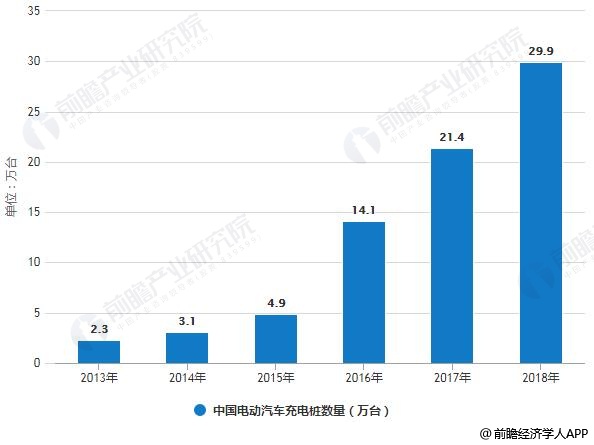 在政策和市场双重作用下,国内充电基础设施高歌猛进,已形成较好的产业基础。据前瞻产业研究院发布的《中国电动汽车充电桩行业发展前景预测与投资战略规划分析报告》统计数据显示,2013年中国电动汽车充电桩数量仅仅为2.3万台,2016年中国电动汽车充电桩数量突破10万台,到了2017年中国电动汽车充电桩数量增长至21.4万台。截止至2018年12月,中国电动汽车充电基础设施促进联盟(充电联盟)联内成员单位总计上报公共类充电桩299752台,较2017年新增公共类充电桩85849台。政策的扶持及相关的财政补贴政策极大的促进了政府和企业充电基础设施建设的发展。