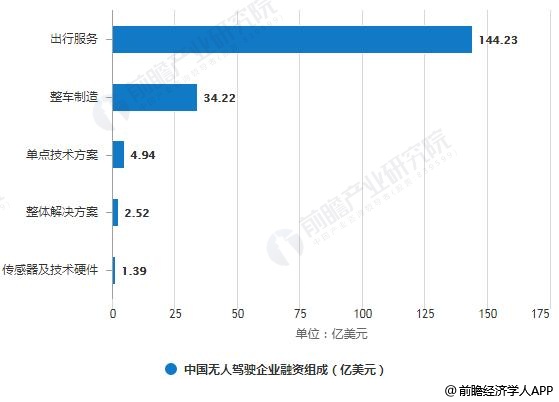 随着国家利好政策的持续出台,无人驾驶行业快速发展,大量资本进入行业。据前瞻产业研究院发布的《中国无人驾驶汽车行业发展前景预测与投资战略规划分析报告》统计数据显示,2017年无人驾驶投融资市场形势大好,在2017年中国无人驾驶企业融资组成情况中,出行服务融资金额最多,融资金额达到144.23亿美元,其后是整车制造企业,融资金额为34.22亿美元,其后分别为单点技术方案、整体解决方案、传感器及技术硬件,融资金额分别为4.94、2.52、1.39亿美元。