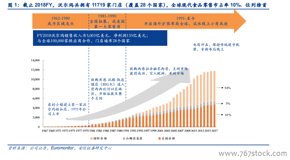 当前业务运营含三个分部,美国分部仍为主要收入、利润来源。据公司公告,沃尔玛业务运营可分为三个部分:美国分部,国际分部和山姆会员店,其中:1)美国分部营收占比约 64%、营业利润占比约 74%,营业利润率约 5.6%,仍为主要收入、利润来源;2013-2017 年营收CAGR 为 3.3%,营业利润 CAGR 为-4.8%;截止 FY2018 涉及实体零售店 4761 家(包括购物广场、折扣店及社区店及其他各 3561、400、800 家)及线上业务 115 亿美元收入,主要靠自有物业展店、自有物流配送(二者占比分别为 84.5%、65.6%)。2)国际分部营收占比约 24%、营业利润占比约 22%,营业利润率约 4.5%,主要负责阿根廷、巴西、加拿大、智利、中国、印度、日本、非洲、中美洲、墨西哥、英国等 27 个国家超市经营(包含国外山姆会员店);2013-2017 年营收 CAGR 为-3.6%,营业利润 CAGR 为 1.0%。