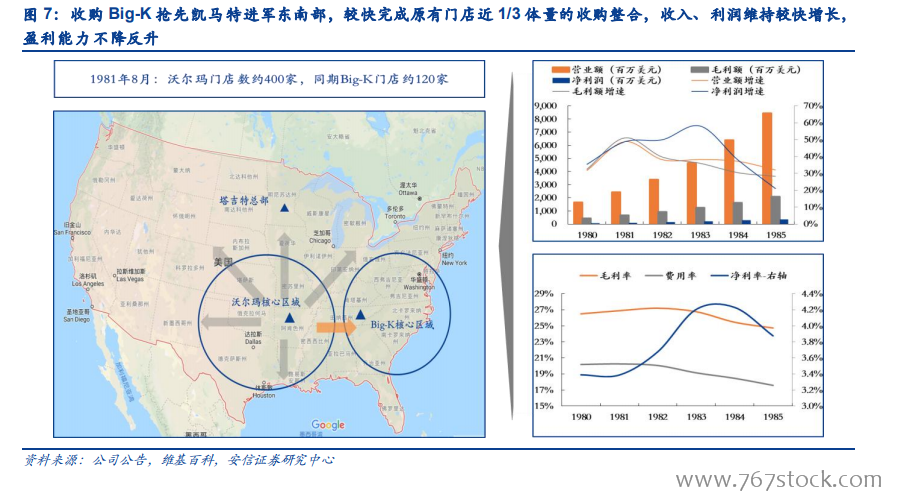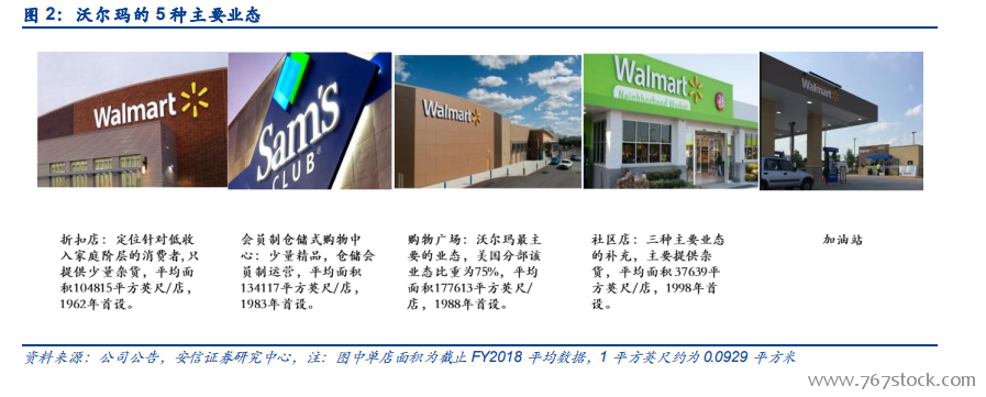 美国本土市占率约 50%,各项指标领先国内龙头。50 年发展过后,沃尔玛已于美国超市行业占据霸主地位:据公司公告及美国商务普查数据,沃尔玛美国本土市占率目前高达 50%,2018FY 单年本土收入合人民币 2.4 万亿元,远高于国内超市龙头高鑫零售、永辉同期单年1076 亿元、586 亿元营收规模。一方面,较高的收入规模及市占率使得沃尔玛对于上游议价权、下游定价权优势突出;另一方面,长期发展过程中的供应链精耕及管理迭代,使得沃尔玛效率相比同行更高,自有品牌发展更好,且在人员、租金、物流等费用端可形成规模效应;较高的盈利能力、周转水平加之杠杆因素影响,导致沃尔玛近年 ROE 稳态水平高于国内龙头。事实上,由于国内超市企业人力成本更具优势、门店租赁比例更高,在规模优势形成、盈利能力上升后,若不考虑杠杆因素,ROE 可能上升空间更大;但同时,在中国当前独特发展背景及经济环境下,行业未来趋势或仍存变数。据此,我们首先复盘沃尔玛成长路,借以其寻找当前国内超市龙头的成长可能,进而探寻当前环境对龙头发展的边际影响。