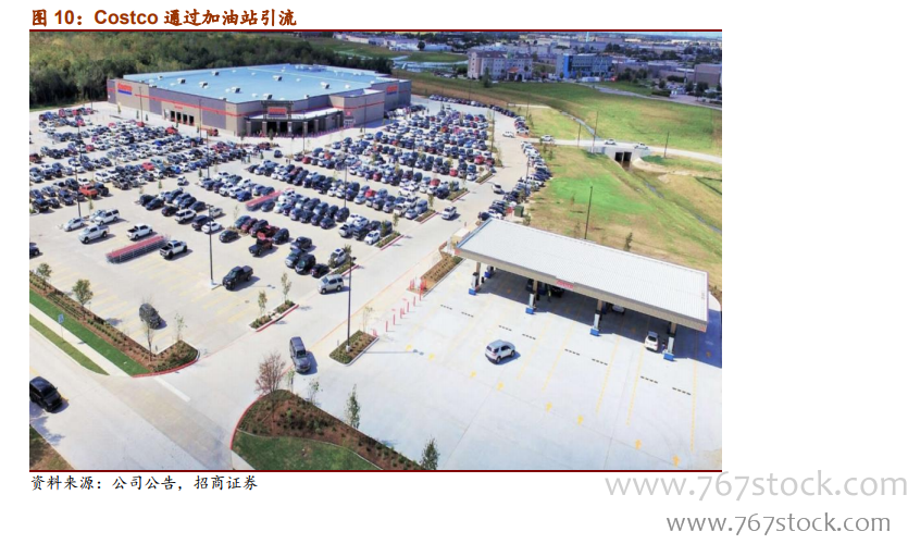 低价加油站引流,助力会员消费。Costco 通过旗下自有的 Kirkland 品牌开展汽油销售业务,1995 年 Costco 在亚利桑那州图森市开了第一家加油站,到 2018 年已经有 567 家。Kirkland 一般提供两种汽油:Kirkland Signature regular unleaded 和 Kirkland Signature premium。这两种汽油都会添加洗涤剂添加剂保持汽车油箱清洁,它们通常是政府规定的最低额的五倍。Costco在年报中将加油站汽油销售归入附加业务中(主要靠加油站业务和药品销售),附加业务在 Costco 总营收中占比提升,可见其战略重要性上升。