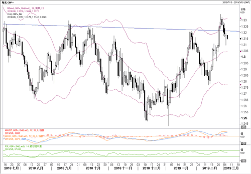 英镑/美元连续第四日下跌,触及日低1.3097后收盘于1.3160;美元广泛上涨冲击汇价,且英国数据疲软,没有退欧方面的利好消息均打压英镑。首先,英国财长Hammond表示他预计英国大检察官Fox和欧盟首席谈判官Michel Barnier之间的谈判不会取得进展。之后英国的McDonnell表示对于下周的投票,预计不会有很多工党议员会支持特蕾莎梅的退欧计划。英国2月服务业PMI录得51,3,前值50.1,就业跌至2011年11月以来最快降速。退欧及其经济数据方面均没有有利消息释放的话,近期英镑恐要延续冲高后的获利回落之路。日线图上,MACD红色动能柱开始收敛,RSI进入平衡线,显示英镑冲高回落态势还难扭转。如果昨日有试空英镑的头寸暂时持有,目标是观察汇价能否再次试探1.31水位的支撑力度,若颇为下个目标1.3070。