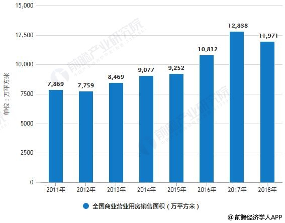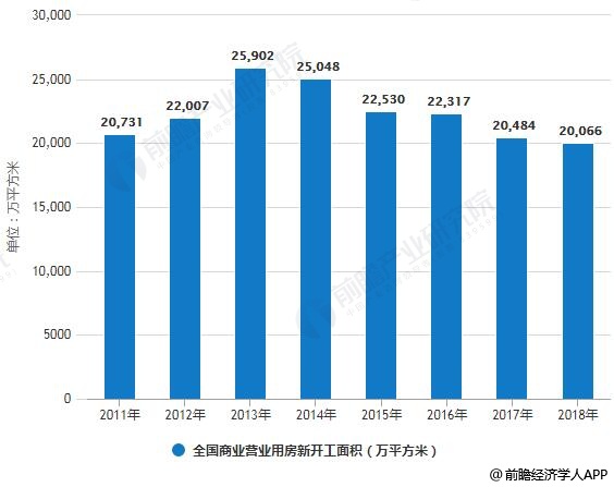 据前瞻产业研究院发布的《中国商业地产行业发展趋势与投资决策分析报告》统计数据显示,2018年1-12月,全国商业营业用房新开工面积为20066万㎡,同比下降2.0%,降幅较1-11月收窄1.2个百分点。2018年1-12月,全国商业营业用房销售面积为11971万㎡,同比下降6.8%,降幅较1-11月扩大1.7个百分点。2018年1-12月,全国商业营业用房开发投资额为14177亿元,同比下降9.4%,降幅与1-11月持平。