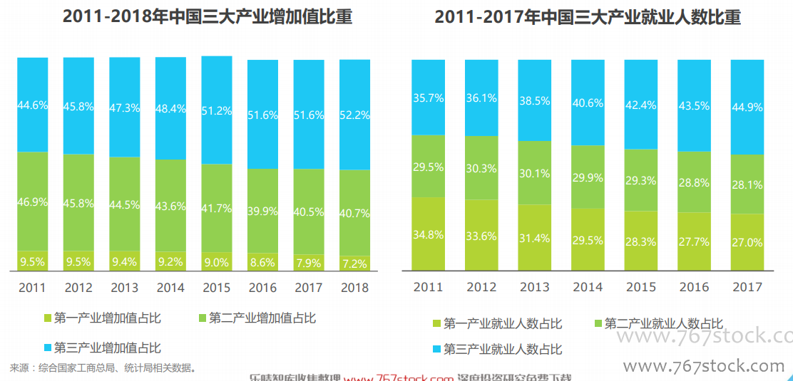 经济结构持续优化,第三产业拉动就业能力依然强劲。得益于产业结构的持续优化,去年2018年第三产业的增幅仍然高于第一产业和第二产业,占比为52.2%,持续为我国经济稳定发展和就业稳定增长作出重要贡献。关于2011年至2017年就业情况,第三产业就业人数累计增加7591万人,就业人数占比由35.7%攀升至44.9%,依然是吸纳就业最多的产业。