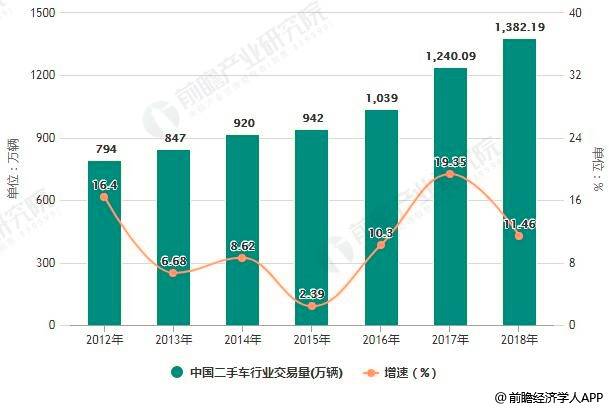 据前瞻产业研究院发布的《中国二手汽车电商行业商业模式与投资战略规划分析报告》统计数据显示,2018年12月,中国二手车交易121.72万辆,环比下降4.58%,同比下降1.11%,交易金额达769.76亿元,这是2018年单月交易量同比首次下滑。累计方面,2018年1-12月全国累计完成交易二手车1382.19万辆,同比增长11.46%,交易金额为8603.57亿元。从2001年至今,中国二手车交易量已经连续第18年持续增长,全国交易量从37万辆增长至1382万辆,增长了37倍。