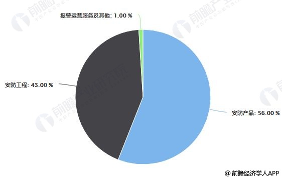 除了规模,我们再以产业结构划分,2017年,安防产品总收入约为3369亿元,占比56%;安防工程总收入为2587亿元,占比43%;报警运营服务及其他约为60亿元,占比1%。