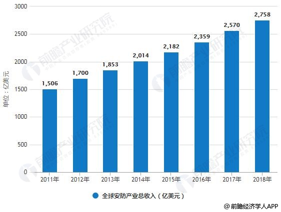据前瞻产业研究院发布的《中国安防行业市场前瞻与投资战略规划分析报告》统计数据显示,2011年全球安防产业总收入已达1506亿美元。并呈现逐年增长态势。2014年全球安防产业总收入突破2000亿元。截止至2017年全球安防产业总收入增长至2570亿美元,同比增长8.9%。初步测算2018年全球安防产业总收入达到2758亿美元左右。